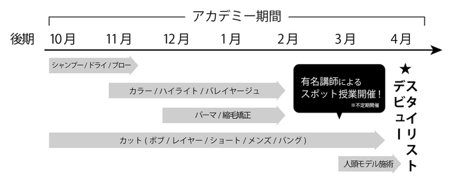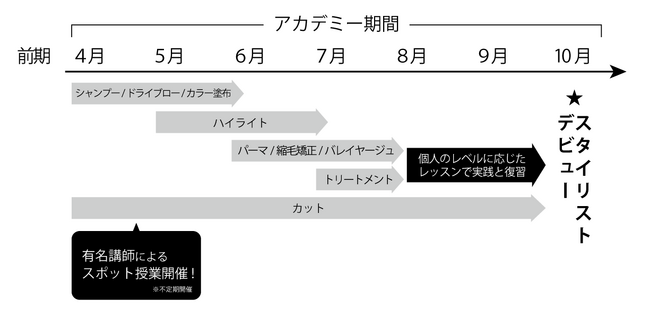 スタイリストを目指す美容師(アシスタント)の方、ブランクのある美容師の方達向けに、最短648時間の集中レッスン(1日9時間×週3回×半年間)でスタイリストデビューが可能なアカデミーを実現!