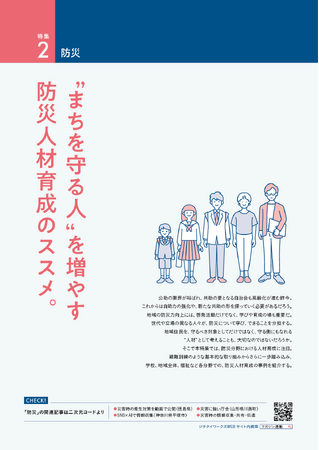 公助の限界が叫ばれ、共助の要となる自治会も高齢化が進む昨今。これからは自助力の強化や、新たな共助の形を探っていく必要があるでしょう。地域の防災力向上には、啓発活動だけでなく、学びや育成の場も重要です。世代や立場の異なる人々が、防災について学び、できることを分担する。地域住民を、守るべき対象としてだけではなく、守る側にもなれる“人材”として考えることも大切なのではないでしょうか。そこで本特集では、防災分野における人材育成に注目。避難訓練のような基本的な取り組みからさらに一歩踏み込み、学校、地域全体、福祉など各分野での、防災人材育成の事例を紹介します。