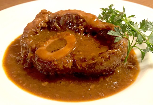 伝統的なミラノの郷土料理。フォンドヴォーと赤ワインで煮込んで風味とコクを出し、お召し上がりいただくタイミングでバルサミコ酢をかけてお召し上がりいただきます。