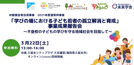 一般財団法人ちくご川コミュニティ財団、一般社団法人家庭教育研究機構、認定NPO法人箱崎自由学舎ESPERANZA、NPO法人未来学舎は、2022年から休眠預金活用制度において学校に行けない・行かない子ども(不登校の子ども)を支援する居場所づくり事業に取り組んで参りました。
