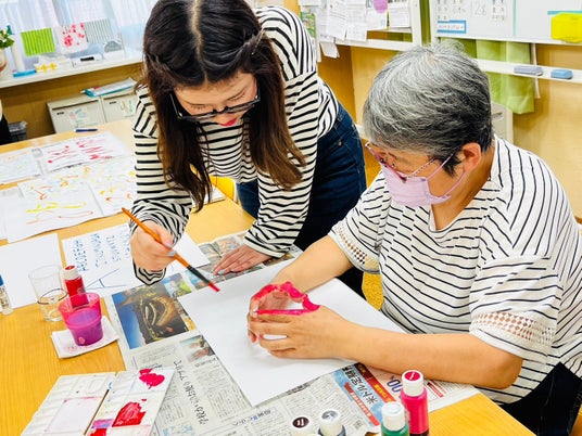 作品のタイトルで行き詰まった時には他の利用者の方々も巻き込んで考えました。「冷麺に見える」という意見が面白く採用となりました。学生さんが来てくれることで、楽しい思い出が増えました。