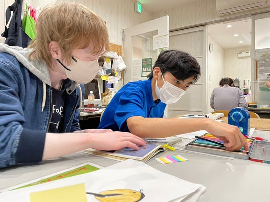 photo by SOLIT!デザインのスキルも経験もスタイルも異なる学生たちは今まで未知の世界だった障がい者支援事業所の現場に出向きました。障がい者支援事業所のアーティストメンバーは初対面の学生たちと対話をしたり、言葉を交わすのではなく、筆やペンを通した対話を行ったりしながら、デザインの元となるアートを共に創作しました。