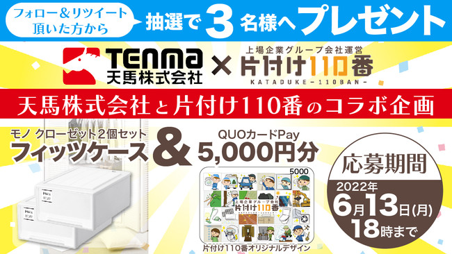抽選対象となるのは、テンマフィッツワールド(@tenma__official)、片付け110番(@kataduke110ban)のTwitterアカウントをフォローし、該当ツイートをリツイートした方です。キャンペーンは2022年6月13日(月)18時まで。当選者にはTwitter上でダイレクトメールをお送りします!
