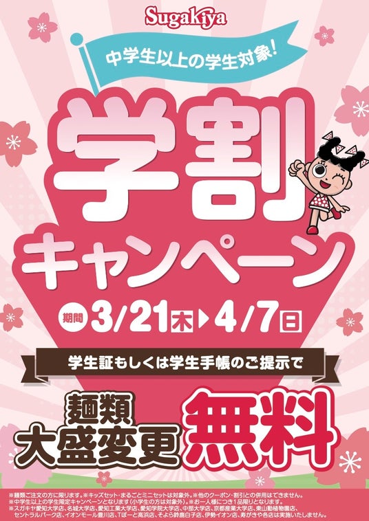 また、春の新生活スタートを応援して、3月21日(木)から4月7日(日)までの18日間、学割キャンペーンを実施いたします。学生証のご提示で、麺類の大盛りへの変更を無料とさせていただきます。