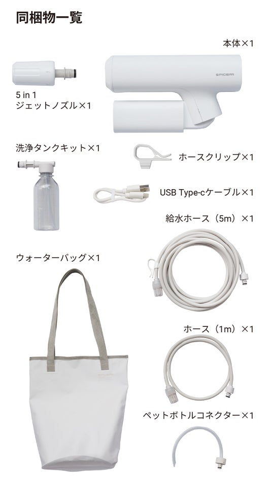 本体×1、5 in 1ジェットノズル×1、洗浄タンクキット×1、給水ホース(5m)×1、ホース(1m)×1、ホースクリップ×1、USB Type-cケーブル×1、ペットボトルコネクター×1、ウォーターバッグ×1