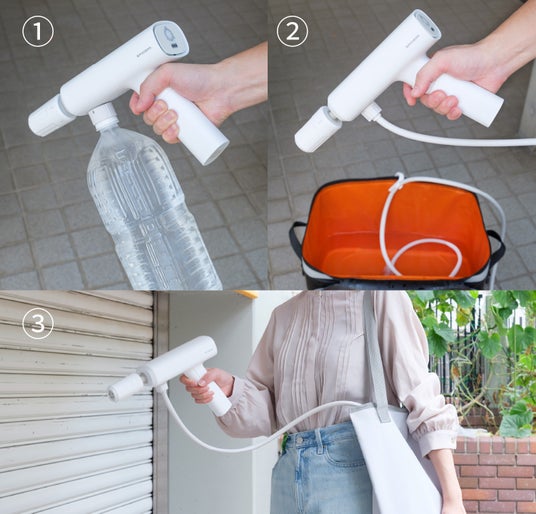 さらにペットボトルやウォーターバッグも使えるため、自宅の庭はもちろん、キャンプに、海に、お墓参りに…水栓レスのため水道が近くにない場所へも持ち運んで使うことが可能です!充電式で面倒なセッティングもないため、家庭用掃除機のようにボタンひとつで手軽に扱えます。