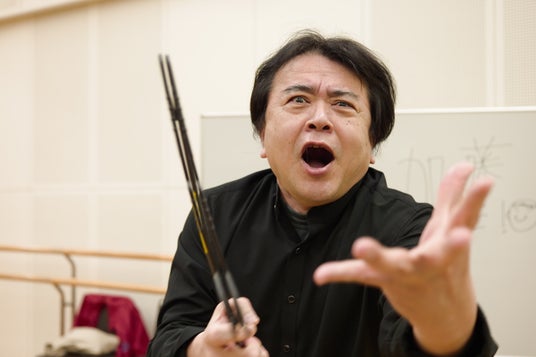 手を広げて手歌パフォーマンスの練習中。
