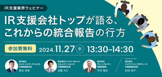 株式会社ブレーンセンター(大阪市北区、代表取締役:稲田紀男)は、株式会社エッジ・インターナショナル、株式会社リンクコーポレイトコミュニケーションズとともに、「これからの統合報告の行方」をテーマに無料WEBセミナーを共催します。