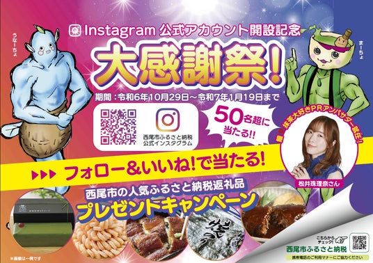 西尾市秘書政策課は、10月29日に発表した「西尾市版ふるさと納税3.0」の取り組みの一つとして、「Instagram公式アカウント開設記念大感謝祭キャンペーン」を実施しています。