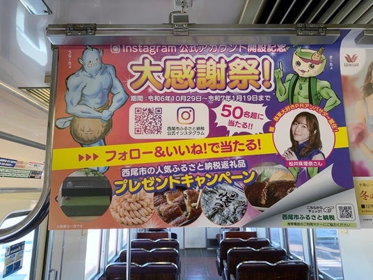 この度、西尾市の特産品の魅力が詰まっているインスタグラム大感謝祭キャンペーンのさらなる周知をはかること及び西尾市ふるさと納税の魅力を広くPRすることを目的に名鉄全線での中吊り広告を展開しましたのでお知らせいたします。