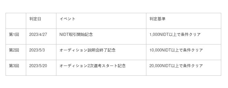 2023年4月25日株式会社オーバースNIDT取引開始&オーディション記念 スペシャルNFT権利を付与~NIDT保有数量で権利取得を判定~4月26日よりスタート、計3回実施!株式会社オーバース(本社:東京都千代田区、代表取締役:佐藤 義仁 以下「当社」)は、当社が発行し2023年4月26日(水)に取引が開始される新規暗号資産であるNippon Idol Token(NIDT)の保有者向けに、NIDT取引開始と『IDOL3.0 PROJECT』のオーディション開催を記念して、判定日におけるNIDTの保有数量が条件を満たすことによりスペシャルNFTを得られる権利を付与することといたしました。権利付与は下記の日付において計3回実施いたします。第1回 4月27日 :NIDT取引開始記念スペシャルNFT第2回 5月 3日 :『IDOL3.0 PROJECT』オーディション説明会終了スペシャルNFT第3回 5月20日 :『IDOL3.0 PROJECT』オーディション2次選考スタート記念スペシャルNFT
