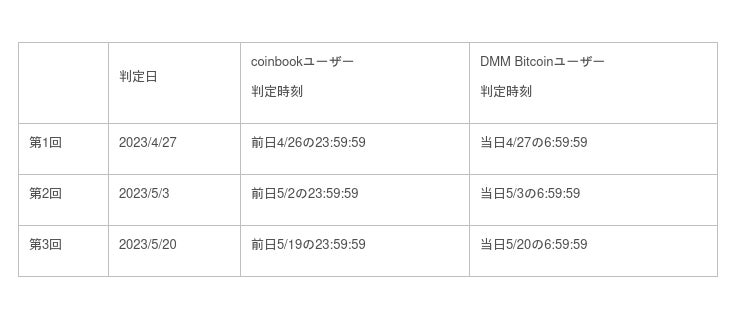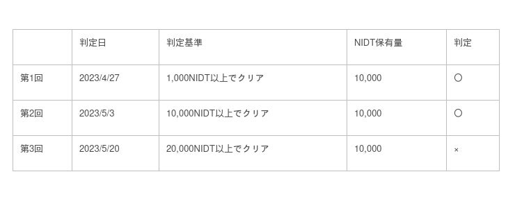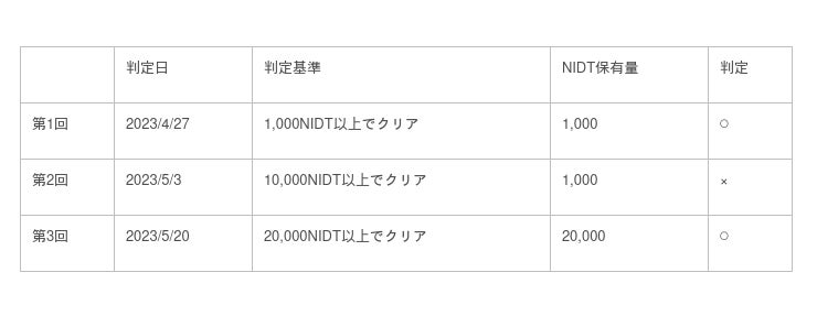 ※NIDTをcoinbook、DMM Bitcoin両社にお持ちの方はその合計保有数量での判定となります。NIDT保有数量に関しては取扱業者である株式会社coinbook及び株式会社DMM Bitcoinと連携したうえで権利を付与いたします。保有数量の判定時刻は各取扱業者の営業締め時間となりますが、両社で時間が異なっておりますのでご注意ください。