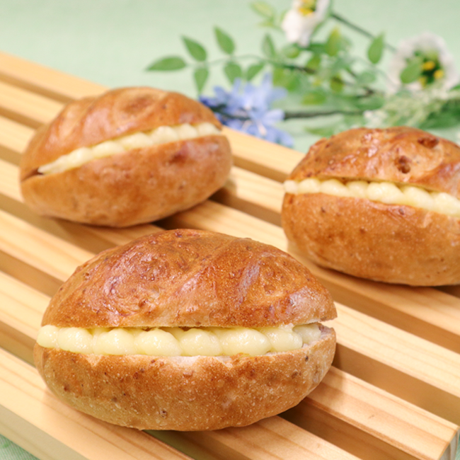 商品特徴:香ばしい食感のくるみを練り込んだ生地に、口に入れた瞬間にとろける甘い特製ミルクバターをサンド。優しい風味に仕上げました。