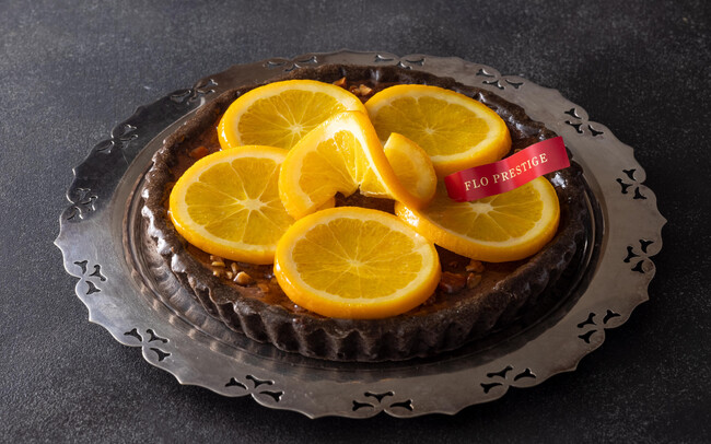 「ショコラオランジュタルト」はココアのシュクレ生地に濃厚なチョコレートアパレイユを入れて焼き上げ、皮まで美味しいオレンジのシロップ漬けを飾ったタルトです。