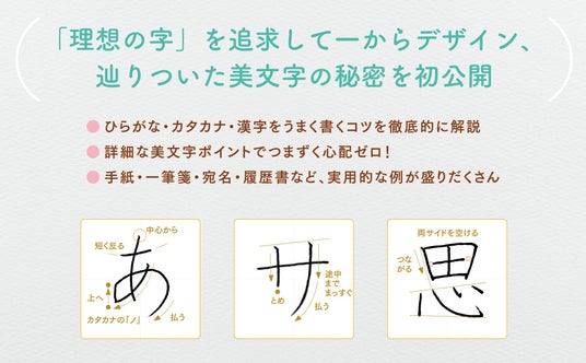 また、美文字を書くための姿勢やペンの持ち方、手の置き方に至るまで丁寧に解説。ひと文字ひと文字、美文字ポイントを豊富に掲載しているので、美文字を習うのははじめてという人でもつまずくことがない内容になっています。