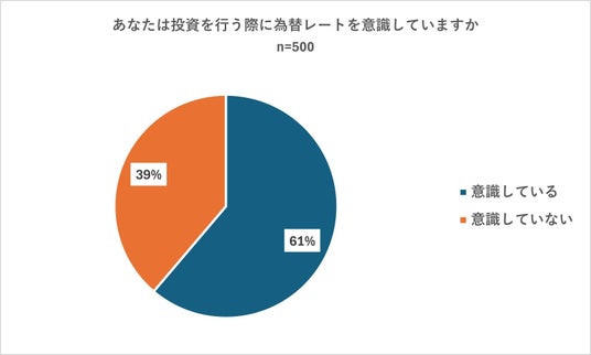 次に、上記の500人に「あなたは投資を行う際に為替レートを意識していますか」と質問したところ「意識している」との回答が61パーセント、「意識していない」との回答が39パーセントとなり、投資の際に為替を意識している方が約6割であることがわかりました。