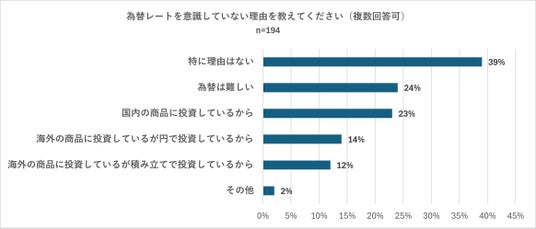 今度は投資の際に為替レートを「意識していない」と回答した194人に対し「為替レートを意識していない理由を教えください」(複数回答可)と質問したところ、「特に理由はない」との回答が39パーセントで最多となりました。2位は24パーセントの「為替は難しい」となり、3位はほぼ同じ割合で「国内の商品に投資しているから」(23パーセント)が入りました。