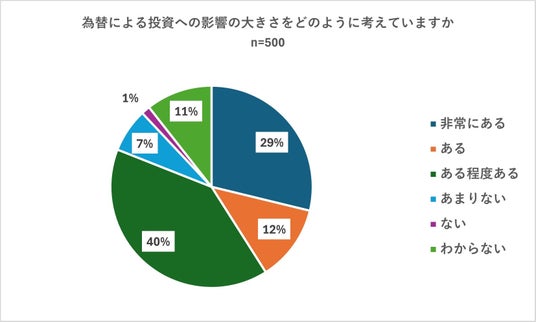 最後に回答者全員に対し「為替による投資への影響の大きさをどのように考えていますか」と尋ねました。その結果「ある程度ある」が40パーセントで最も多くの回答を集めました。以下は「非常にある」(29パーセント)、「ある」(12パーセント)、「わからない」(11パーセント)となりました。「非常にある」、「ある」、「ある程度ある」の合計は81パーセントとなり、8割の方が程度の差はあっても為替が投資に影響を及ぼしていると考えていることがわかりました。