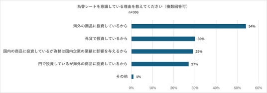 続いて前の質問で為替レートを「意識している」と回答した306名に対し「為替レートを意識している理由を教えてください」(複数回答可)と尋ねました。その結果は「海外の商品に投資しているから」が54パーセントでトップとなりました。以下、ほぼ同じ割合で「外貨で投資しているから」(30パーセント)、「国内の商品に投資しているが為替は国内企業の業績に影響を与えるから」(29パーセント)、「円で投資しているが海外の商品に投資しているから」(27パーセント)との回答が続きました。