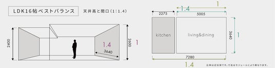 白銀比(1:1.4の比率)は、古くから日本建築において美しいとされてきた比率です。自然界にも白銀比に似た比率が見られ、視覚的な安定感や調和を生み出します。この白銀比を建築デザインに採用することで、落ち着きやバランスの取れた印象を与え、空間には奥行き感が生まれます。