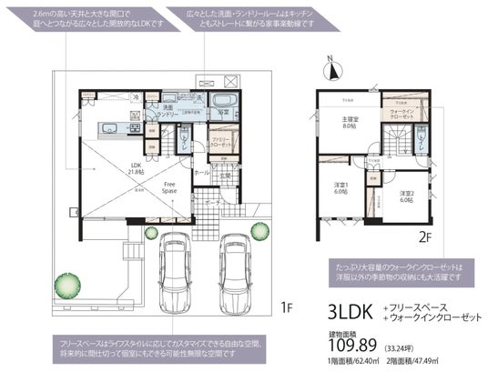 ■ 敷地面積/109.89平方メートル 延べ床面積/109.89平方メートル (33.24坪) 1階面積/62.40平方メートル 2階面積/47.49平方メートル