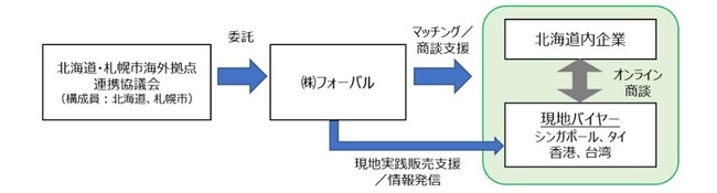 本委託業務は、コロナ禍により生じたリベンジ消費を取り込むため、北海道の人気が高いアジア・ ASEAN諸国を対象に、北海道と札幌市が連携し構成する「北海道・札幌市海外拠点連携協議会」において、日本貿易振興機構や北海道ASEAN事務所、現地関係機関や企業等とのネットワークを活用しながら、道産品に関する商談や現地事業者と連携した販売支援を行うこととしています。