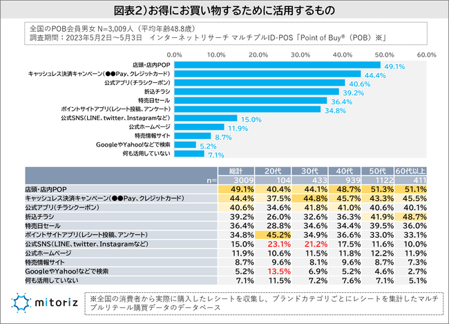 お得に買い物するため活用している媒体やサービスは「店頭・店内POP」が最も多く49.1%