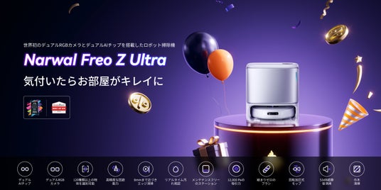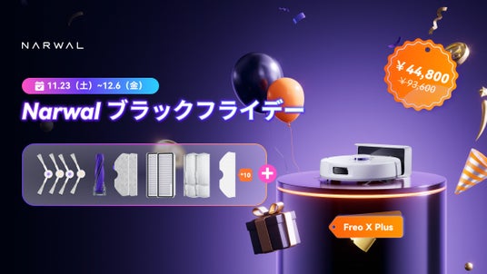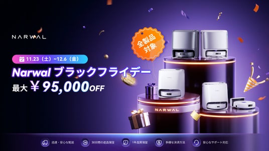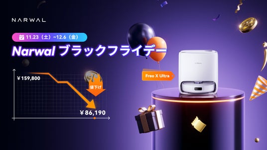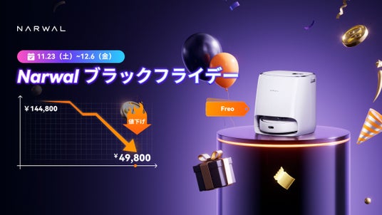 Narwal Japan株式会社(東京都中央区)は、2024年11月27日(水)より、Amazonブラックフライデーセールに参加します。ブラックフライデー期間限定で、Narwalロボット掃除機を最大66%オフとなるセールを実施します。本セールでは、Narwalの全製品が特別価格で登場し、特に注目となるのは人気モデル「Freo X Ultra」「Narwal Freo」等の大幅割引です。この機会をぜひお見逃しなく!