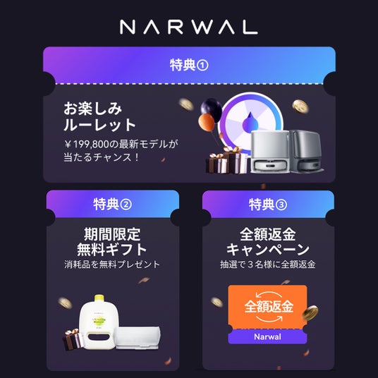 ブラックフライデーを記念してNarwal Japan公式サイトとSNSは期間限定の特別キャンペーンを実施中です。Narwal Japan公式サイト限定のお得な特典をぜひご利用ください。