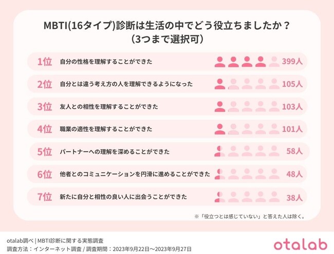 続いて、人々がMBTI診断をどのように活用しているのかを知るべく、「MBTI(16タイプ)診断は生活の中でどう役立ちましたか?」という質問を行った。