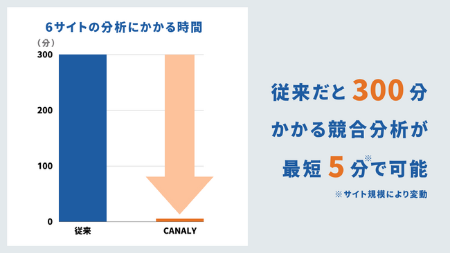 本機能では、一度に最大5サイト分の競合サイトデータを取得し、それらを自社と直接比較することが可能です。従来は1サイトあたり1時間近くかかる競合分析が、自社と競合を合わせて6サイト分まとめて最短5分で行えます。CANALYはSEOにおける意思決定時間を大幅に短縮し、競争力の強化を支援いたします。