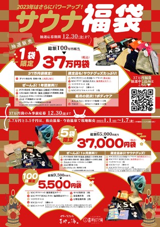 愛媛県で「伊予の湯治場 喜助の湯」「しまなみ温泉 喜助の湯」を展開する総合エンターテイメント企業・キスケ株式会社(本社:愛媛県松山市、代表:山路義則)は、サウナーを日本一応援する施設を目指す「kisuke Sauna club」(キスケ サウナ クラブ、以下kSc )がプロデュースするサウナ福袋 全3種類(37万円、3万7千円、5千5百円)を、2023年1月1日(日)より数量限定で発売いたします。