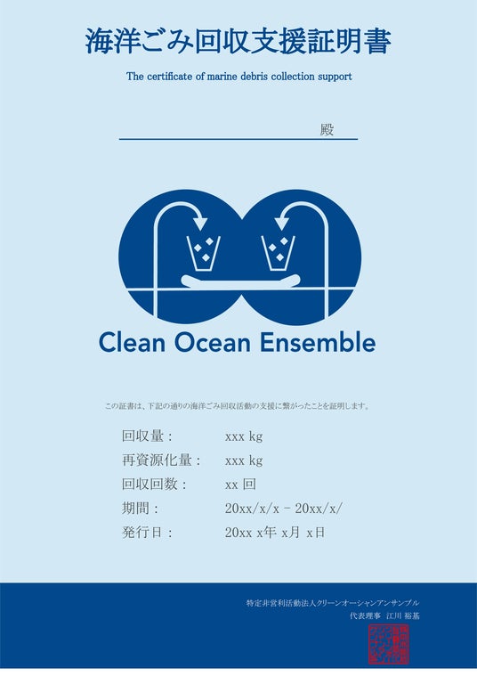 『海洋ごみ回収支援証明書』は、NPO法人クリーンオーシャンアンサンブルが発行する協賛企業向けの証明書です。支援金で具体的にどのくらいの回収量等の結果に繋がったのかを証明します。協賛企業は金額によってどのくらい海洋ごみ問題に貢献したのかを可視化することができます。