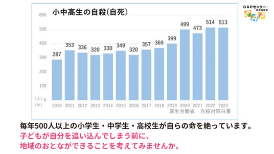 どうすることもできないと生きる自信をなくし、「死にたい」「消えたい」と悩み苦しんでいる子どもの数は計り知れず、そして、すべてをあきらめて自ら命を絶つ子どもが年間500人以上いるのです。
