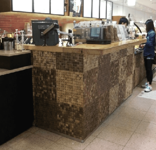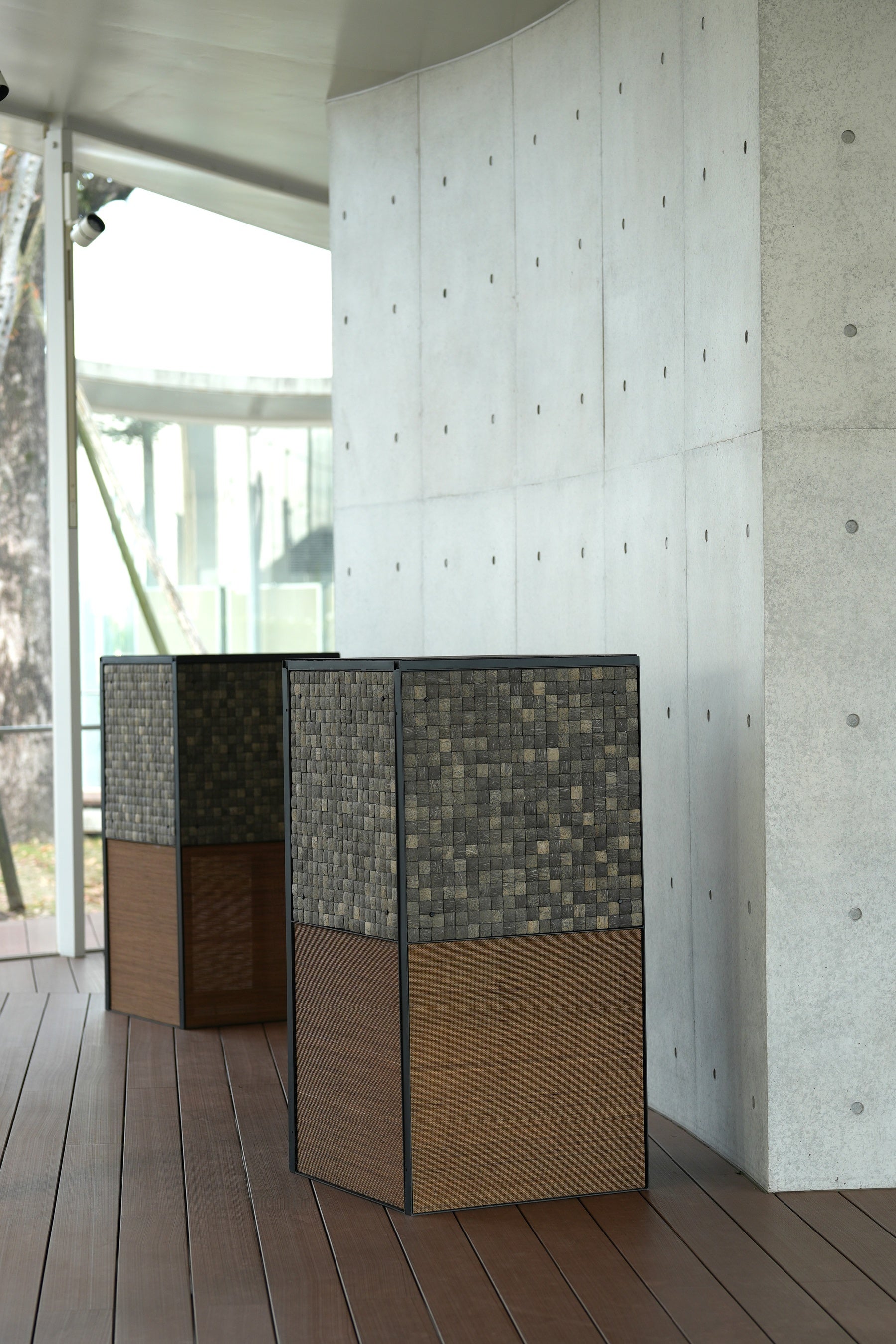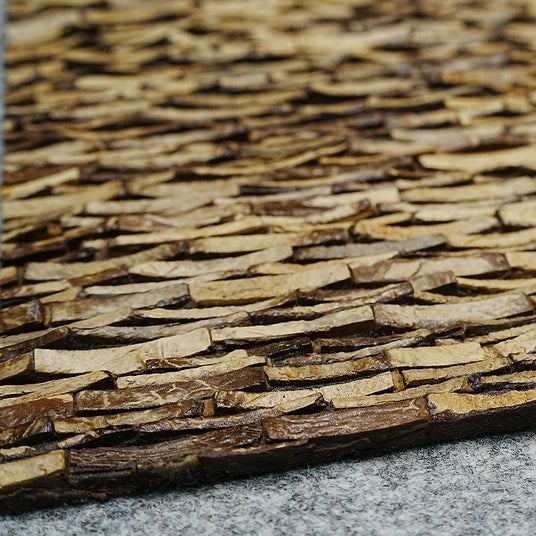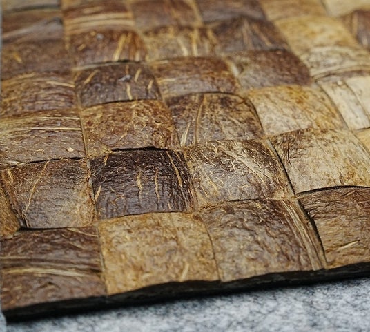 本製品は、本来廃棄されるココナッツ殻をチップ化し、内装材として再利用したアップサイクル素材から生まれた、天然素材の装飾用モザイクタイルです。家具・建具・間仕切りなどの装飾用途を想定し、天然素材を商空間で“使える意匠”として成立させることを目的に開発されました。