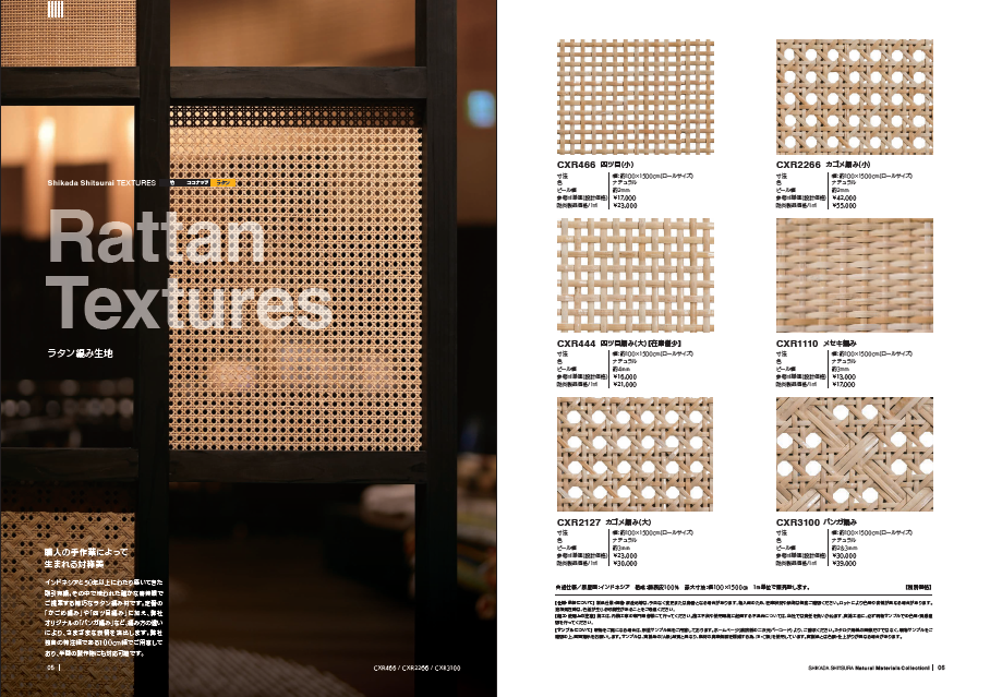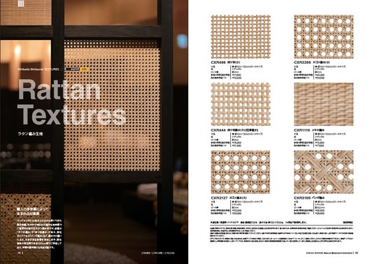 ラタン編み生地は、幅1000mm×長さ15mの特注ロール対応により、半間幅の造作物にも無駄なく使用できる点や、コントラクト用途を前提に、全量A級品のみを選別したうえでコンテナ輸入を行うことで、製品ごとのバラツキを抑え、設計段階で安心して仕様指定できる品質の安定性が高く評価されています。本コレクションは、天然素材でありながら、防炎性能や供給品質といったコントラクト市場で求められる要件を満たす素材群として、設計者にとって実装しやすい選択肢を提案します。