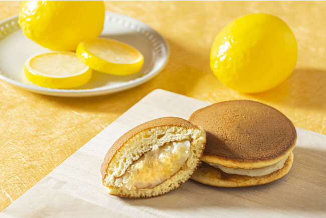 卵黄と卵白をわけて泡立てる製法でつくるふわふわのどら焼き皮で、瀬戸内レモンのピールをいれたレモン餡をサンドした夏限定のどら焼きです。