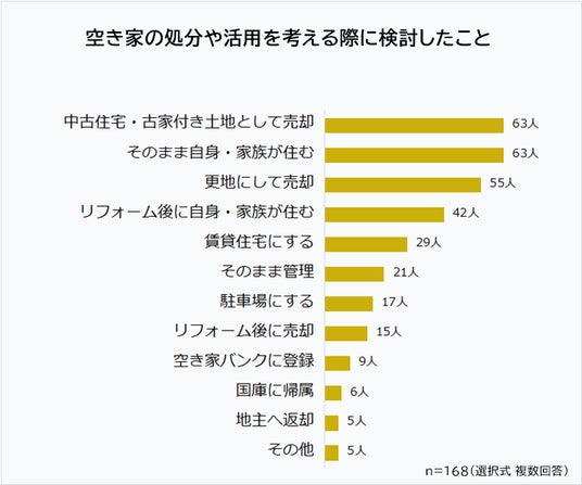 空き家の所有経験がある168人に「空き家の処分や活用を考える際に検討したこと」を聞きました。