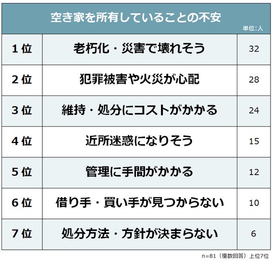 その結果、1位は「老朽化・災害で壊れそう(32人)」でした。続いて2位「犯罪被害や火災が心配(28人)」、3位「維持・処分にコストがかかる(24人)」、4位「近所迷惑になりそう(15人)」となっています。