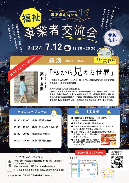 この度、7月12日(金)に開催する【福祉事業者交流会】では、社会福祉法人名古屋ライトハウス「日々のくらし相談室(視覚総合相談室)」所属の藤下直美氏をスペシャルプレゼンターとしてお招きし、実体験を基にした講演『私から見える世界』を同時開催する予定。