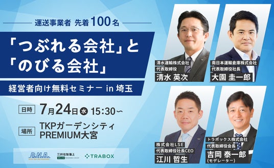 トラボックス株式会社(本社:東京都渋谷区、代表取締役社長:皆川 拓也)は、運送会社の経営者向け無料セミナー「つぶれる会社」と「のびる会社」 in 埼玉を開催いたします。