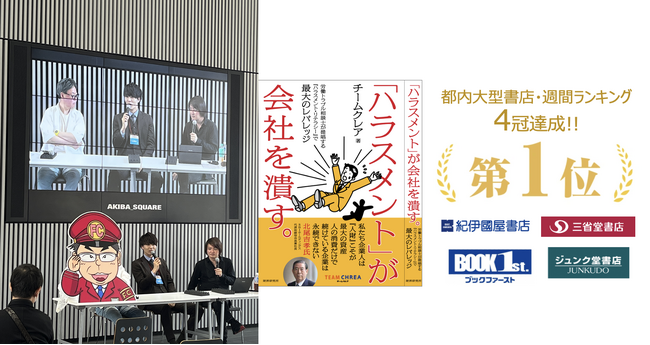 当日は、パワハラに関連するクイズを出題し、正解者にはチームクレア共著の執筆書籍をプレゼントする特別企画を実施しました。配布した書籍は、経営者のノーベル賞と称される財界研究所から出版した「ハラスメントが」会社を潰す。(チームクレア著)」で、大手書店の週間ランキングイベント1位を記録しています。15時からはステージ登壇し、加盟店検討者を含めた参加者との商談を行い、大盛況のうちにイベント終了となりました。