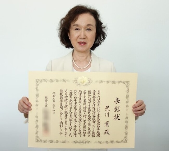 総務省には、30年ほど前から、情報通信関係の委員会に委員として参加させていただき、2005年からは、情報通信審議会委員を8年務め、2013年からは、電気通信紛争処理委員会委員、及び委員長代理を2022年まで務めさせていただきました。この長い期間に渡る私の活動が高く評価されましたことをとても嬉しく思います。情報通信は、社会を支える基盤技術として人々の生活に浸透してきましたが、今後も私達の社会をより良い方向に導くことが期待されています。豊かで快適な未来社会の実現に向けて、情報通信がますます発展することを願っております。