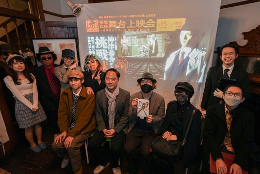 夕刻に集まった参加者たちは 思い思いの探偵コスプレで登場。シャーロック・ホームズや工藤俊作、そして今回の上映作品に出てくる神津恭介など、様々ないで立ちのミステリーファンたちが開演を待ちます。上映会は、神津恭介から参加者に向けたメッセージ動画からスタート。池袋では、不可解な事件が頻発しており、神津一人では手に負えないため、探偵の素質がある人物を見つけるために今回の上映会が開催されたという設定でイベントが始まりました。
