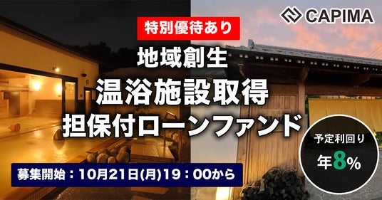 貸付型クラウドファンディングプラットフォーム「CAPIMA(キャピマ)」を運営するアバンダンティアキャピタル株式会社(東京都千代田区:代表取締役 舩越亮)は、新しいファンド「地域創生 温浴施設取得 担保付ローンファンド#1」の募集を10月21日(月)19時より開始いたします。