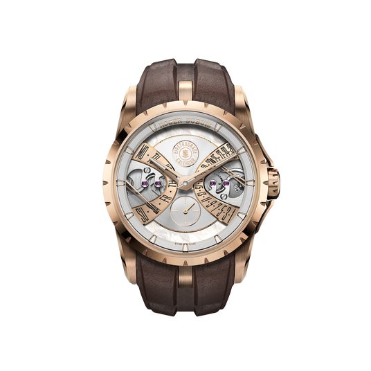 40mmという洗練されたサイズは、ロジェ・デュブイが1990年代に製造したモデルの典型的なサイズにならっています。薄型のケースは18Kピンクゴールド製で、文字盤にはホワイトマザーオブパールを採用。ロジェ・デュブイは、2000年代初期にピンクゴールドとマザーオブパールを紳士用腕時計に使用した最初のマニュファクチュールの一つであり、それゆえにメゾンの磨き抜かれた技術と斬新さを体現するこれらの素材は特別深い意義を持っています。