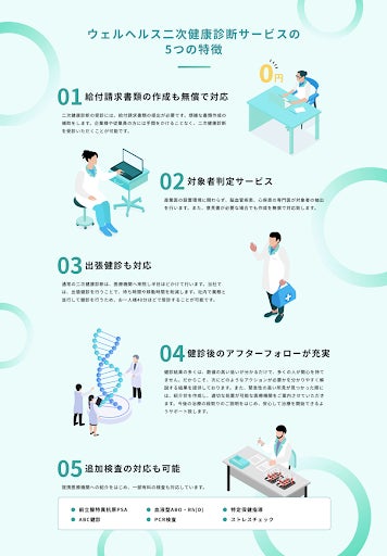 当社は、企業の健康管理強化を推進すべく、労災保険を活用した二次健康診断※の導入支援を行っております。企業・医療機関双方を一気通貫でサポートし、円滑な二次健康診断の実現を行います。また、オフラインで培った実績をもとに健康管理のインフラを構築すべく事業展開を多角的に進めます。