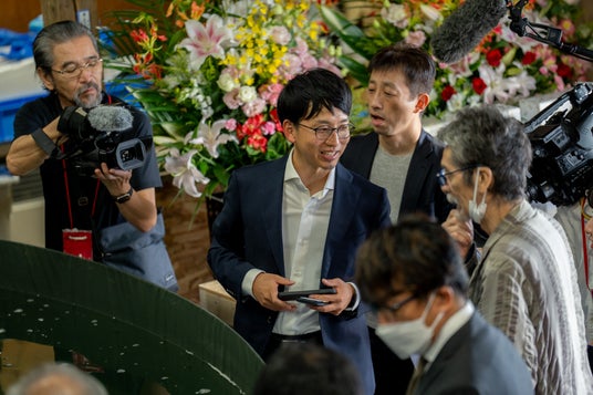 たくさんの報道陣に囲まれ、質問に答える黒田さん