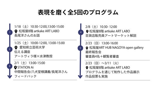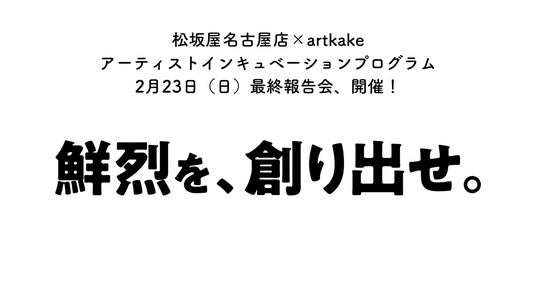 株式会社artkake(所在地:愛知県名古屋市、代表取締役:夏目)は、松坂屋名古屋店と協同で進めてきた若手作家支援のインキュベーションプログラム「artkake new wave」の最終報告会を、2025年2月23日(日)に松坂屋名古屋店8階 ART HUB NAGOYA open galleryにて開催いたします。