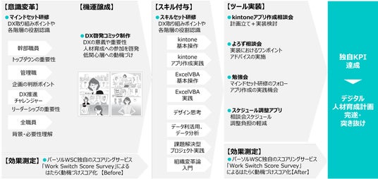 令和5年度に引き続き、「研修の実施(マインドセット研修、スキルセット研修)」や「相談業務支援(よろず相談会、kintoneアプリ作成相談会)」に加えて、DXの機運醸成に向けた「DX啓発コミック制作」や、当社独自のスコアリングサービス「Work Switch Score Survey」などによる効果測定で支援実施前後における“はたらく動機づけのスコア化”などを実施します。